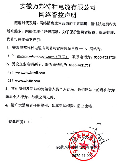 - 安徽萬邦特種電纜有限公司技術力量厚,生產工藝好,檢測設備完善,質量高,管理科學,品種繁多......查看詳細